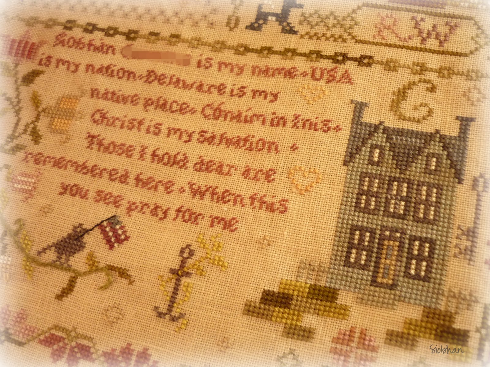 I had so much fun with this sampler, trying to figure out which beloved family member would be featured in each block. I changed the personalization in For Those Recorded Here to reflect more of me as the stitcher of the sampler. The Irish verse relates to the town where we live.